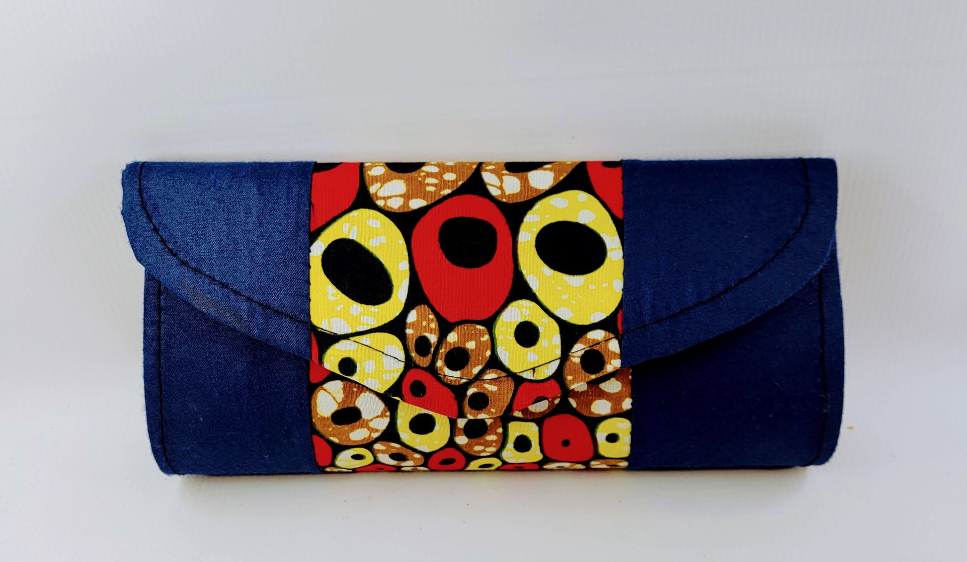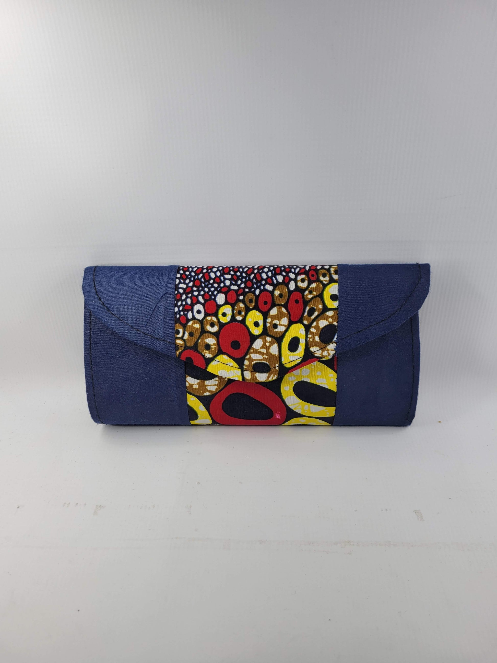 This handcrafted clutch combines deep navy blue fabric with a bold Ankara strip featuring circular patterns in vibrant yellow, red, black, and brown. Its structured silhouette makes it versatile for both casual outings and elegant evenings. The mix of modern minimalism and African artistry ensures it’s not just a purse but a statement piece.