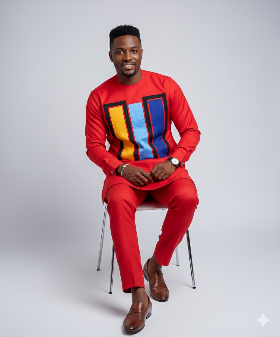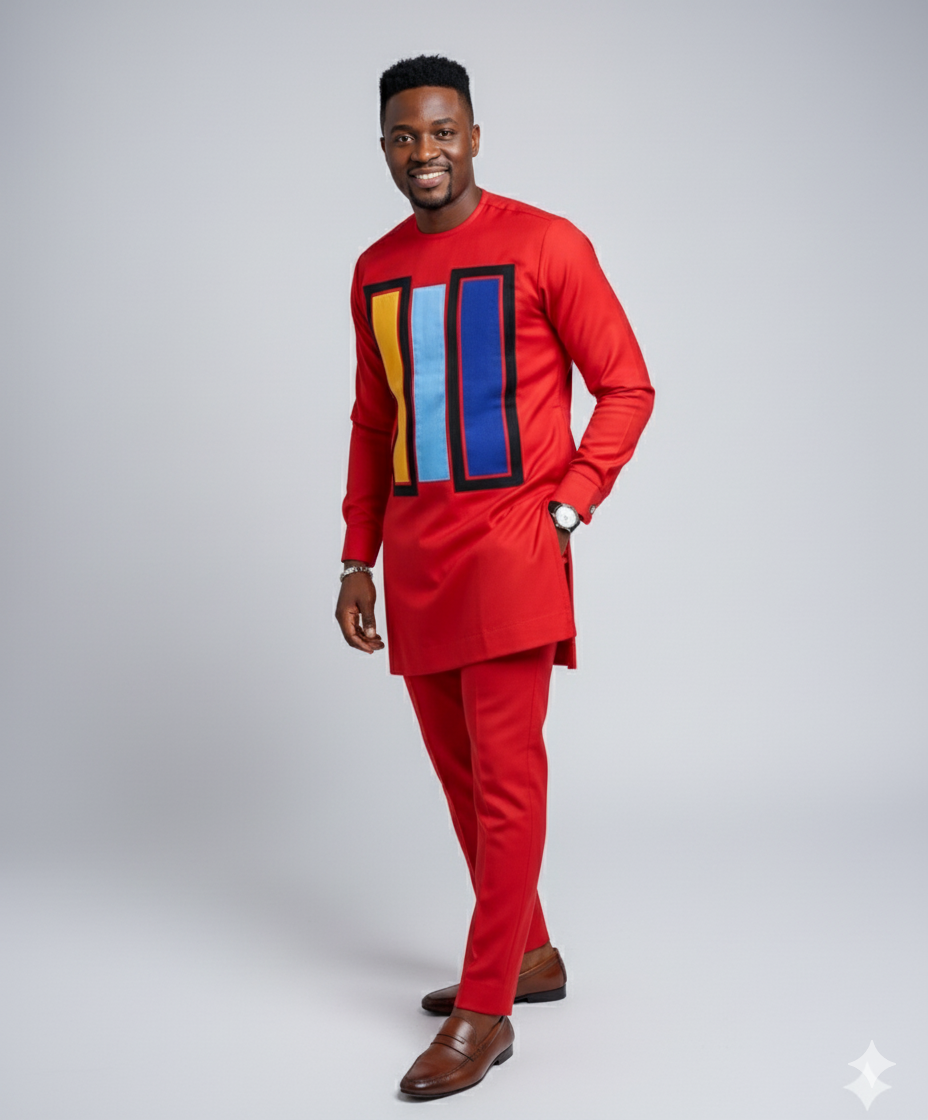 Description: Make a vibrant statement with this striking Orange Senator Suit, a perfect blend of modern design and cultural flair. This two-piece ensemble features a long-sleeved tunic in a rich, eye-catching red, dramatically accented with a central panel of contrasting color blocks: bright yellow, sky blue, and deep royal blue, each outlined in sharp black. The tailored red trousers complete the sleek and contemporary silhouette.