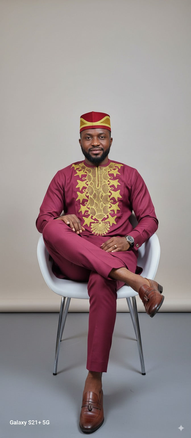 Command attention with this stunning Senator, richly adorned with intricate gold embroidery. The elaborate design cascading down the chest and the detailing on the cuffs and cap exude an air of opulence and cultural grandeur. This ensemble is a powerful statement piece, perfect for those who desire a blend of traditional artistry and luxurious contemporary style. Crafted from high-quality fabric, it offers both comfort and an imposing silhouette, ideal for special events, celebrations, or making an unforgettable impression.
